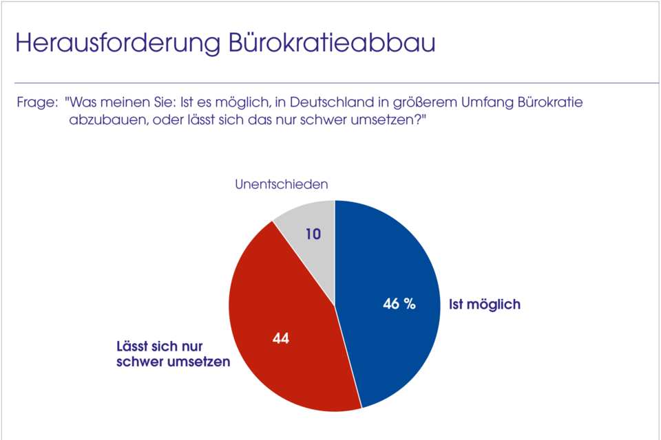 > Zweifel am Abbau bürokratischer Hürden: Die Möglichkeiten, bürokratische Hürden zu beseitigen, wären aus Sicht der Bevölkerung also vielfältig. Doch: Ob deren Umsetzung tatsächlich gelingt, daran bestehen weit verbreitete Zweifel. Immerhin 46 Prozent der Südwest-Bevölkerung halten es grundsätzlich für möglich, dass in Deutschland Bürokratie in größerem Umfang abgebaut werden kann. Aber: Fast ebenso viele äußern Bedenken. Sie gehen von einer nur schweren Umsetzung aus.