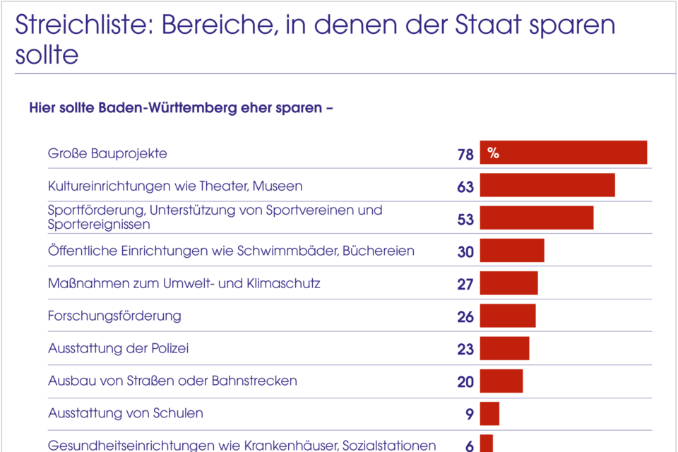 > Für Krankenhäuser schlagen die Herzen: Die Baden-Württemberger (94 Prozent) wollen, dass das Land mehr Geld in Gesundheitseinrichtungen wie Krankenhäuser oder Sozialstationen investiert. 91 Prozent fordern größere Investitionen in die Ausstattung von Schulen und 80 Prozent in den Ausbau von Straßen und Bahnstrecken. Und: Jeweils rund drei Viertel wünschen sich außerdem höhere Ausgaben für die Ausstattung der Polizei, für die Förderung von Forschungsvorhaben sowie für Maßnahmen zum Schutz von Klima und Umwelt.