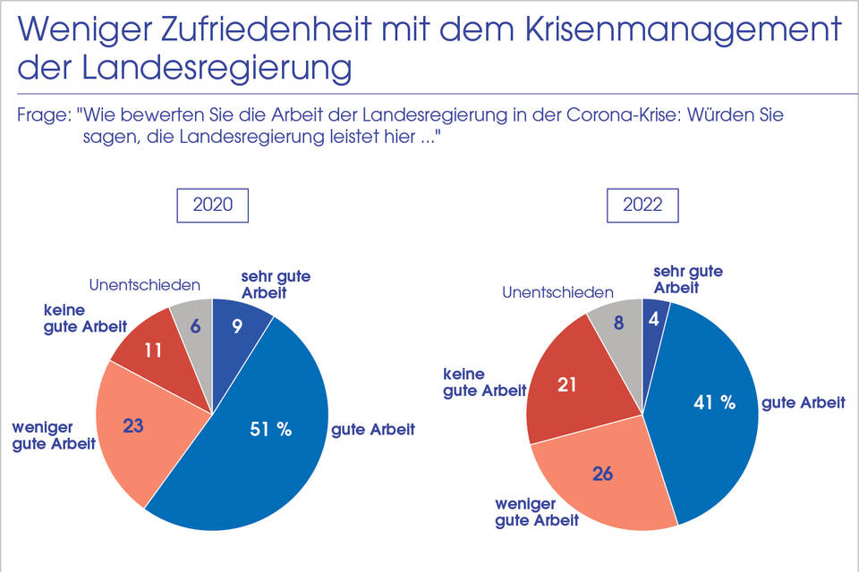 > Zu wenig Kontrolle: Von denjenigen, die mit dem Krisenmanagement grundsätzlich zufrieden sind, werden andere Probleme häufiger genannt. An der Spitze steht hier die Klage, dass die Einhaltung der Regeln zu wenig kontrolliert werden (48 Prozent) – bei den Unzufriedenen beklagen das nur 31 Prozent. Fehlende Planbarkeit durch häufige Änderungen wird auch hier stark kritisiert (41 Prozent). 30 Prozent sagen, die Landesregierung reagiere meist zu spät auf das Infektionsgeschehen. 35 Prozent gehen die Maßnahmen nicht weit genug. Und: Nur acht Prozent der Befragten bezweifeln, dass die Regierung eine Strategie habe.