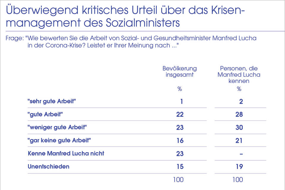 > Maßnahmenchaos: Hauptkritikpunkt der Unzufriedenen ist die fehlende Transparenz und Verständlichkeit der Maßnahmen. So beklagen 67 Prozent Widersprüche und Willkür bei den Maßnahmen, 66 Prozent die "ständigen" Änderungen, deretwegen man kaum planen könne. 61 Prozent finden, die Landesregierung habe "keine Strategie, keinen Plan". Jeder zweite fürchtet wirtschaftliche Schäden durch die Maßnahmen. 39 Prozent der Befragten halten zudem die Einschränkungen für übertrieben – während 23 Prozent schärfere Maßnahmen als die jetzt geltenden wünschen (siehe Grafik).