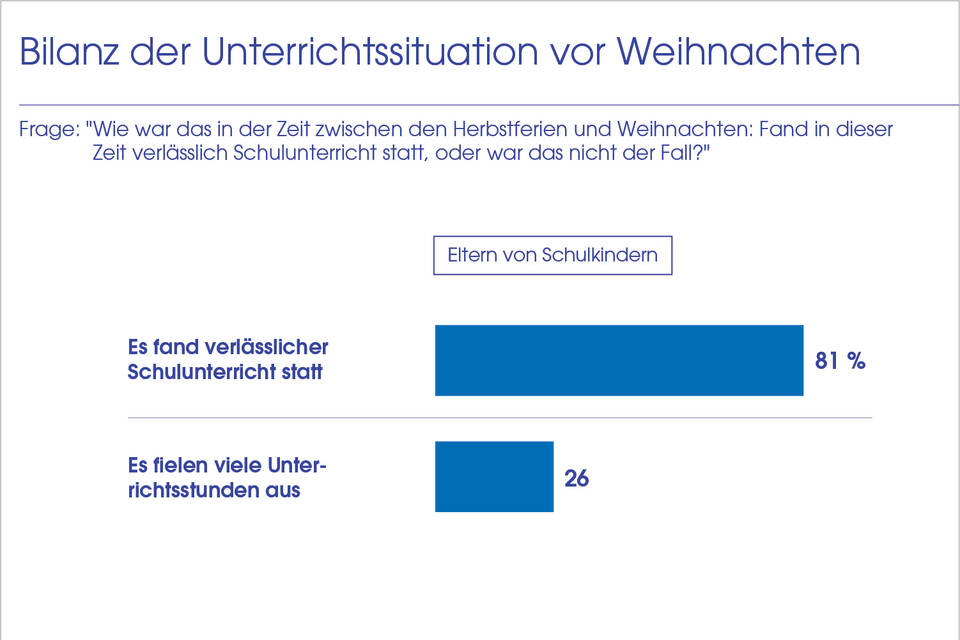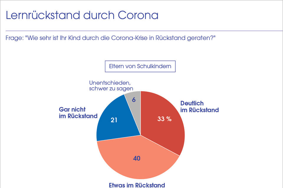 > Lernrückstände: Eine Mehrheit der Eltern sieht ihm Lernstoff zumindest leichte Rückstände (40 Prozent). 33 Prozent sehen ihr Kind gar "deutlich" im Rückstand. Immerhin 21 Prozent glauben, dass ihre Kinder ohne Lernlücken durch die Pandemie gekommen sind.