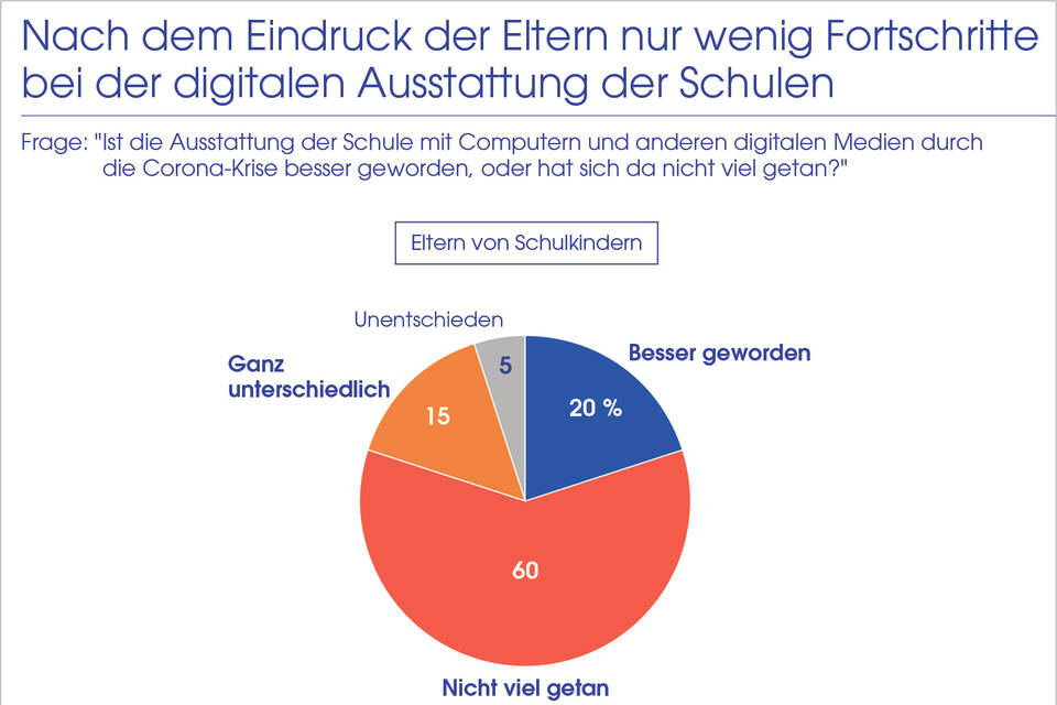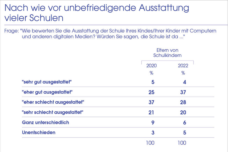 > Digitalisierungsstillstand: 60 Prozent der befragten Eltern sagen, dass sich in zwei Jahren "nicht viel getan" habe bei der digitalen Ausstattung der Schulen. Jeder Fünfte sieht Verbesserungen. Das zeigt sich auch in der Frage, wie man grundsätzlich die digitale Ausstattung beurteilt. 2020 sagten nur 30 Prozent, die Schule sei "eher gut" ausgestattet – inzwischen sind es 41 Prozent (+11). Gleichzeitig sagen weiterhin 20 Prozent, die Schule sei "sehr schlecht" ausgestattet (2020: 21 Prozent).