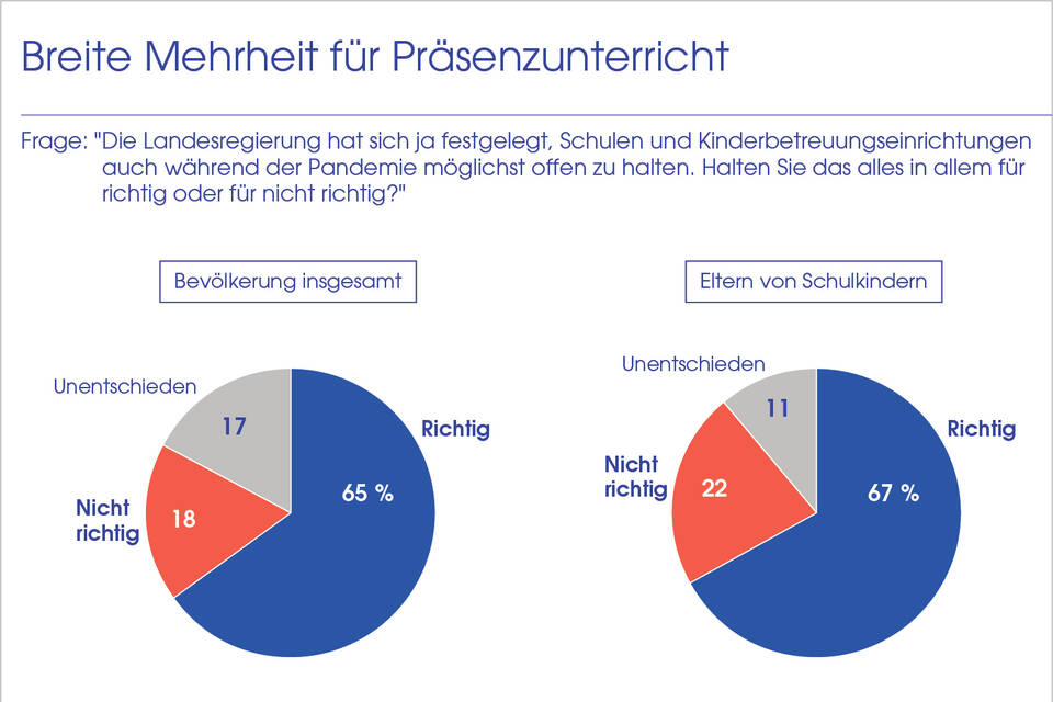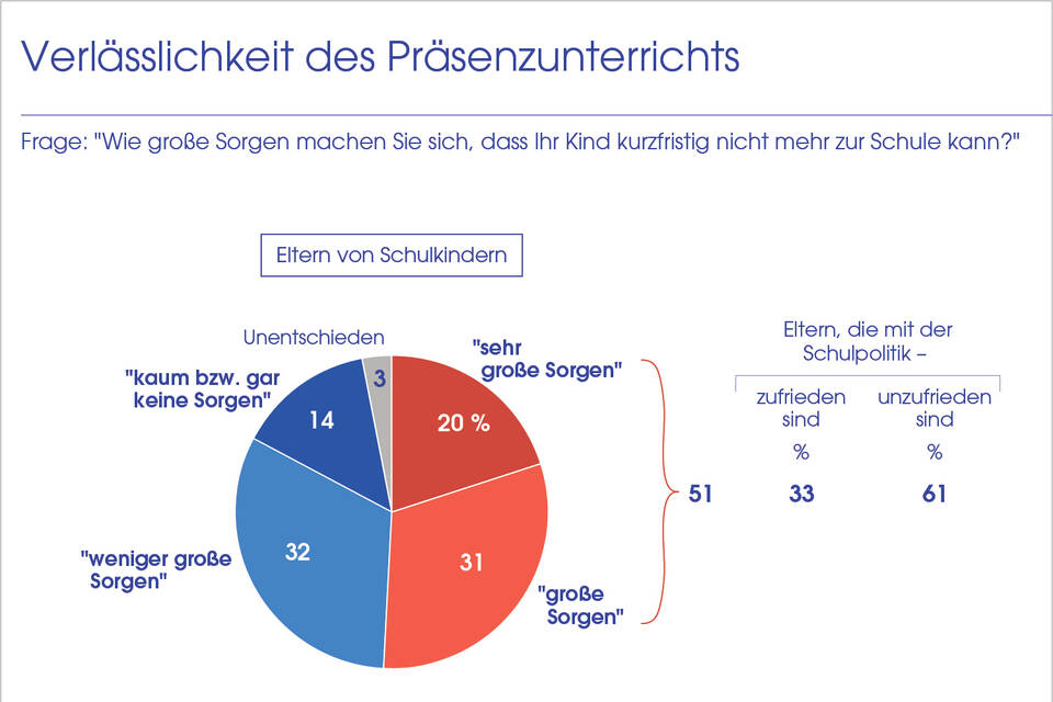 > Mehrheit für Präsenzunterricht: Die Entscheidung, Schulen und Kitas offen zu halten, wird von einer deutlichen Mehrheit begrüßt – 65 Prozent aller Befragten halten das für richtig, nur 18 Prozent für falsch. Die Werte sind bei Eltern fast deckungsgleich. Bei diesen zeigt sich auch, dass 51 Prozent große bis sehr große Sorgen haben, dass die Kinder in den nächsten Monaten nicht mehr zu Schule können. Nur 14 Prozent machen sich da kaum Sorgen. Unter Eltern, die unzufrieden mit der Schulpolitik sind, haben 61 Prozent Sorgen wegen kurzfristigem Unterrichtsausfall, unter zufriedenen nur 33 Prozent.