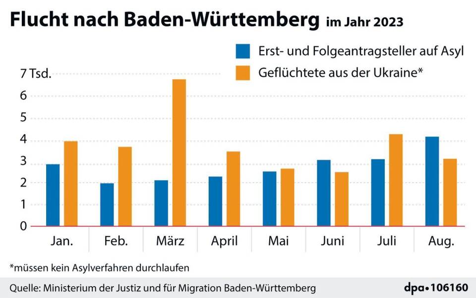 Wie viele Geflüchtete sind seit Anfang des Jahres nach Baden-Württemberg gekommen? Aus der Ukraine Geflüchtete nicht mitgerechnet, waren es bisher (Stand August) mehr als 21.000 Menschen. Nach Angaben des Migrationsministeriums kamen dabei allein im August fast 4000 Menschen. Die Gesamtzahl dürfte bis Jahresende noch beträchtlich zunehmen. "Erfahrungsgemäß sind die Herbstmonate besonders zugangsstark, so dass mit einem weiteren Anstieg zu rechnen ist", teilte eine Sprecherin mit. Zum Vergleich: 2022 waren allein zwischen September und Dezember mehr als 14.000 Geflüchtete ins Land gekommen. Insgesamt wurden im vergangenen Jahr fast 28.000 Geflüchtete als Asylerst- oder Folgeantragssteller registriert.