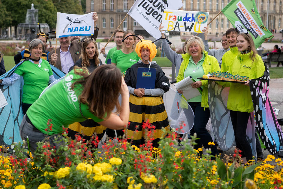 Unter dem Motto "Rettet die Bienen" ist das Volksbegehren für mehr Artenschutz am Dienstag in Baden-Württemberg angelaufen. In rund 15 Städten in Baden-Württemberg sammelten die Naturschützer und Bienenfreunde nach eigenen Angaben Unterschriften. Am Stuttgarter Schlossplatz warben zeitweise rund 20 Naturschützer für das Volksbegehren, sie waren teils in Bienenkostümen verkleidet und riefen "Damit die Bienen bleiben, unterschreiben!".