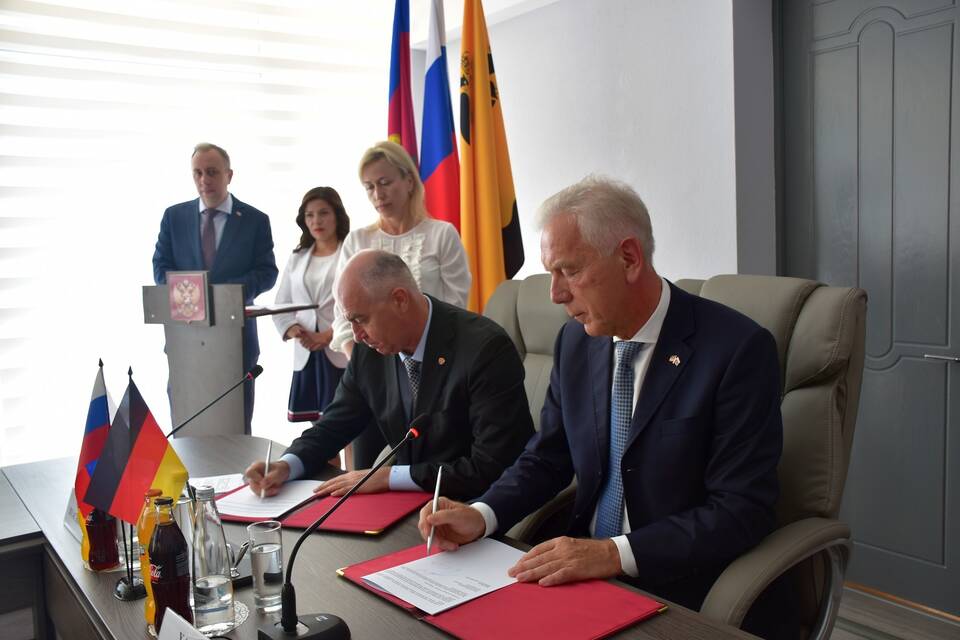Oberbürgermeister Harry Mergel (re.) und sein russischer Amtskollege Igor Djacenko bei der Vertragsunterzeichnung. Foto: Küpper/Stadt Heilbronn