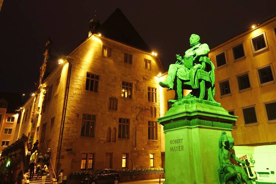 Robert Mayer, der bedeutendste Sohn Heilbronns und hier vor dem Rathaus augenfällig ins Licht gerückt, hätte wohl seine Freude am geplanten Beleuchtungskonzept zur Bundesgartenschau 2019 gehabt. Foto: Armin Guzy