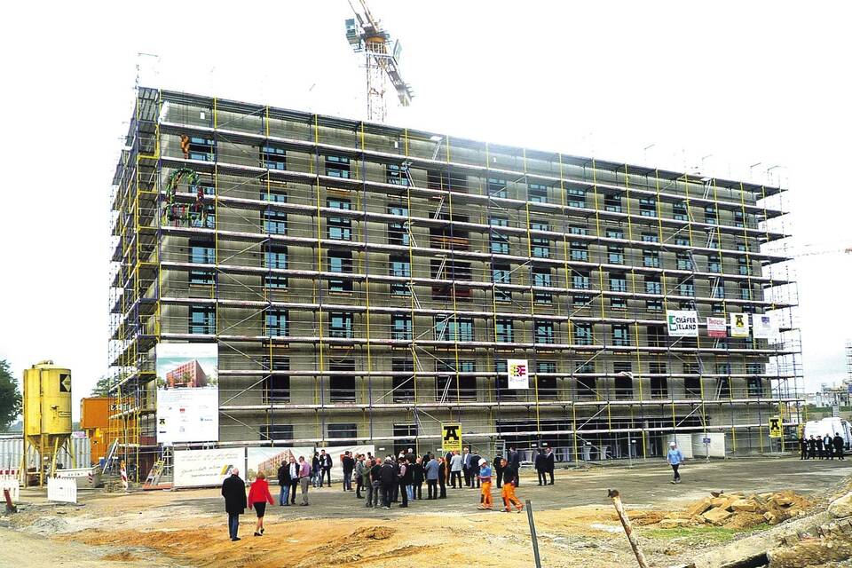 Im nächsten Sommer soll die neue Jugendherberge auf dem Gartenschaugelände fertig sein. Jetzt wurde Richtfest gefeiert. Foto: bfk