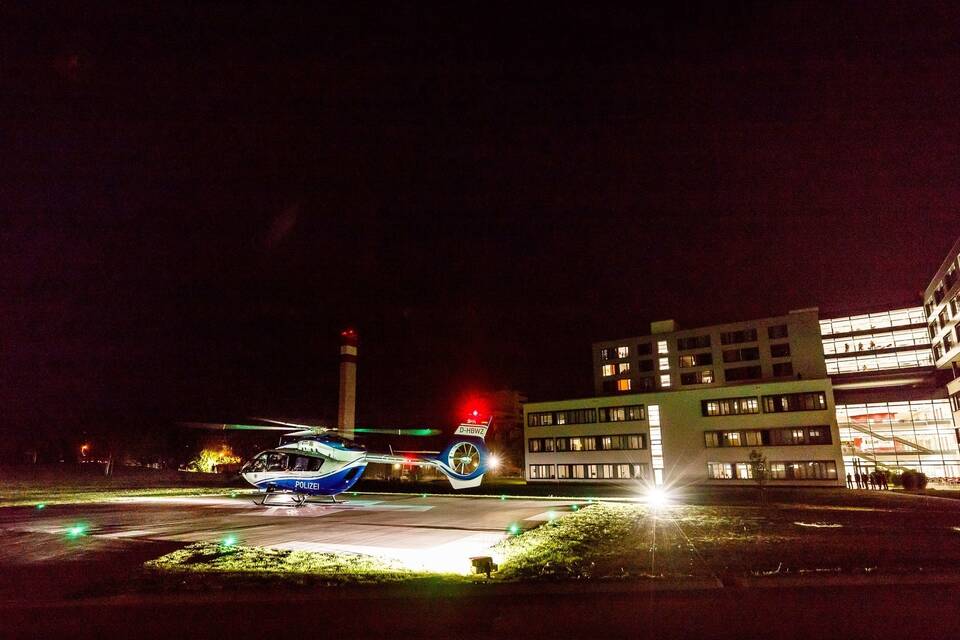 Um den Hubschrauberlandeplatz mitsamt Flugbefeuerung des Klinikgebäudes und der Hochspannungsmasten zu testen, führte die Polizeihubschrauberstaffel einen Probeanflug bei Nacht durch. Foto: SLK-Kliniken/M. Stark