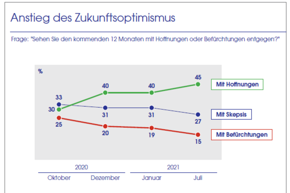 > Die Stimmung hellt sich auf: Die Baden-Württemberger blicken wieder zunehmend optimistisch in die Zukunft. 45 Prozent der Befragten gaben an, sie blickten eher hoffnungsvoll auf die kommenden zwölf Monate – fünf Prozentpunkte mehr als noch im Winter. Skeptisch sind 27 Prozent, Befürchtungen haben 15 Prozent.