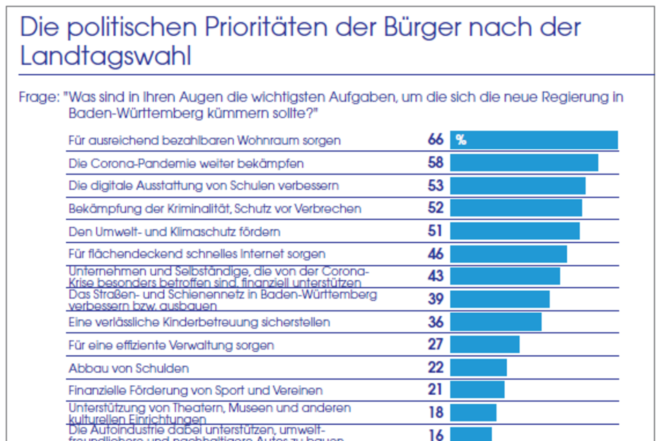 > Wohnraum wichtigstes Thema: An die Spitze der wichtigsten Aufgaben für die neue Landesregierung stellten die Befragten die Schaffung von ausreichend bezahltem Wohnraum. Zwei Drittel der Befragten zählten das zu den Top-Aufgaben. In der Rangliste folgen die Pandemie-Bekämpfung (58 Prozent), die digitale Ausstattung der Schulen (53), die Kriminalitätsbekämpfung (52) und der Umwelt- und Klimaschutz (51 Prozent).