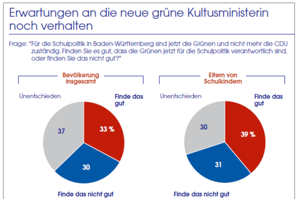 > Volle Amtszeit für Kretschmann: 73 Jahre ist der Ministerpräsident inzwischen alt – und im Wahlkampf hatten politische Gegner gern spekuliert, ob er denn überhaupt die volle Legislatur im Amt bleiben wolle. Von den Befragten wünschen das 45 Prozent, während 32 Prozent dafür sind, dass Winfried Kretschmann das Amt schon vorher an einen Nachfolger übergibt. Aus Regierungslager gibt es eine noch deutlichere Mehrheit für die volle Amtszeit: 68 Prozent der Grünen- und 64-Prozent der CDU-Anhänger sind dafür.