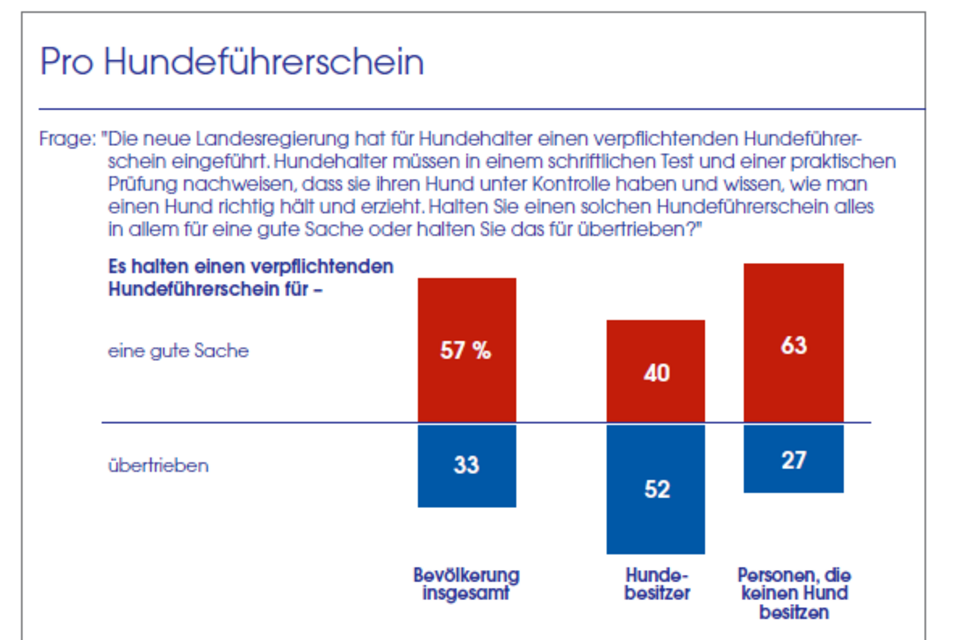 > Hundebesitzer gegen Hundeführerschein: Den geplanten Sachkundenachweis für Hundebesitzer halten 57 Prozent für eine gute Sache. Ausschlaggebend sind hier allerdings diejenigen, die selbst kein Tier haben. Die Hundebesitzer lehnen zu 52 Prozent die Pläne ab – nur 40 Prozent sind dafür.