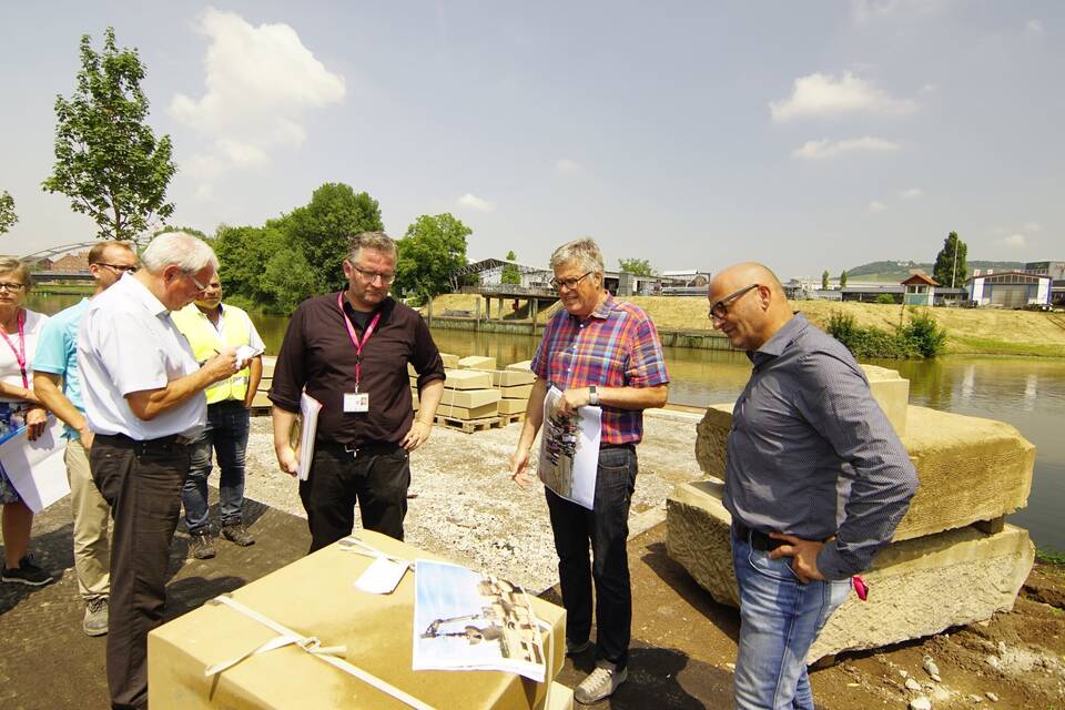 Der Neckaruferpark, 1,4 Hektar groß, wird ein Ort von hoher Aufenthaltsqualität werden und er transferiert ein Stück Heilbronner Geschichte so in die Gegenwart, dass diese sichtbar bleibt. Heilbronner Sandstein, aber nicht irgendeiner, wird die Optik mit prägen: Mauern und Uferbefestigungen, an denen vielleicht sogar einmal Hotelschiffe anlegen werden, wurden auch mit jenen 200 Sandsteinen gestaltet, die als "historisches Material" behutsam "recycelt", so geschliffen wurden, das sie wie neu aussehen.