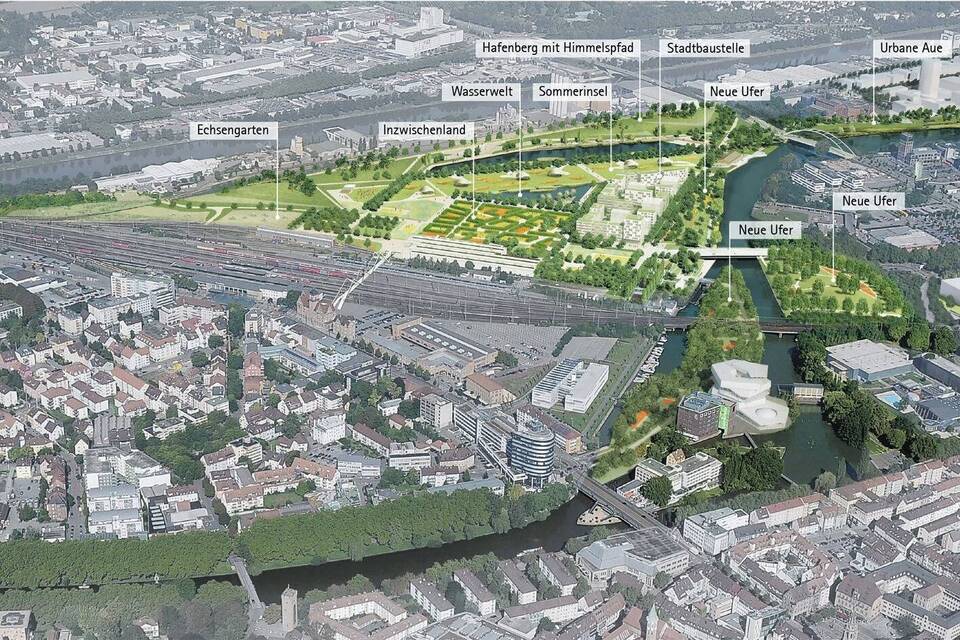 Die konzeptionelle Aufteilung der Buga - und insofern auch die Zukunft, als auf diesem Bild die Kranenstraße (beim Insel-Hotel) bereits rückgebaut ist und die experimenta II und auch der Bildungscampus II und III (die weißen Gebäude) schon steht. Foto: Stadt