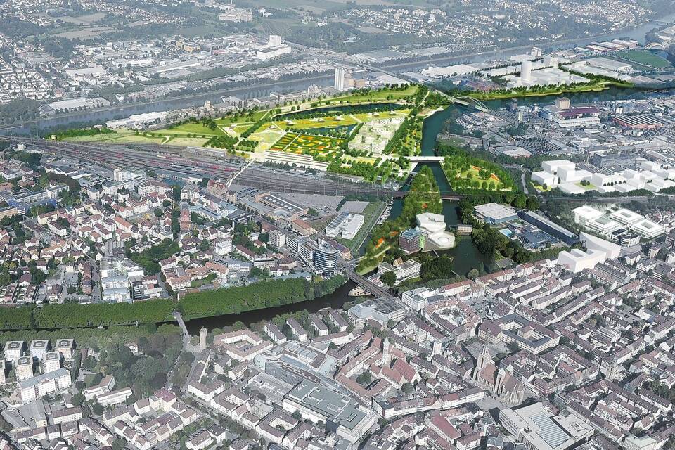 Die Visualisierung zeigt den Kernbereich der Buga (grünes Dreick), auf der Neckarinsel davor ist der erst entstehende Neubau der experimenta II neben der experimenta I (Backsteingebäude) zu sehen. Die weiße Brücke über den Neckar läuft auf den geplanten "Campus-Park" zwischen Buga-Gelände/Neckarbogen und Campus zu, die Bogenbrücke darüber ist die Karl-Nägele-Brücle. Die Abbildung zeigt auch die neuen, noch nicht vorhandenen Straßenführungen. Foto: privat