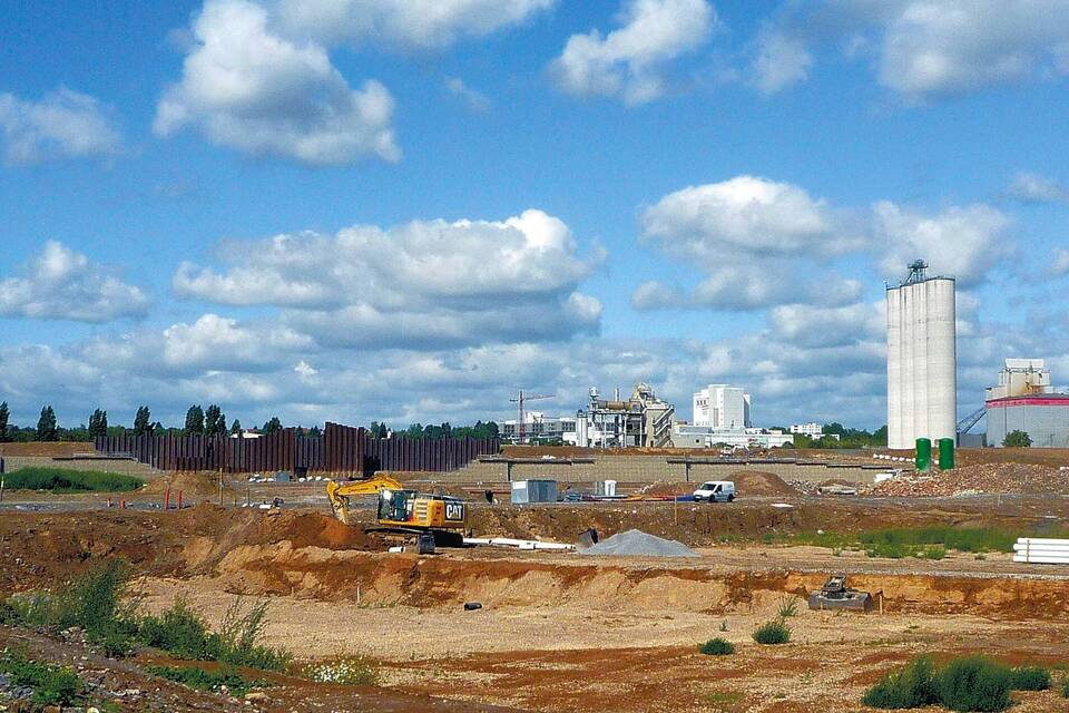 Aktueller Stand des Buga-Geländes Heilbronn: Im Hintergrund die fertige Spundwand, die das Industriegebiet und den Neckarkanal verdeckt, wo später eine Kletterwand entstehen und die auch als Lärmschutz dienen soll. Foto: Fritz