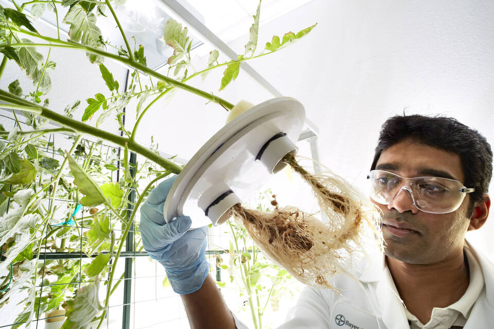 Ein Forscher von Bayer begutachtet die Auswirkungen von Pflanzenschutzmittel auf die Wurzeln einer Tomaten-Pflanze. Im Zuge des Verkaufs der Bereiche Saatgut und Unkrautvernichtungsmittel sollen 1800 Mitarbeiter zur Ludwigshafener BASF wechseln. Foto: dpa