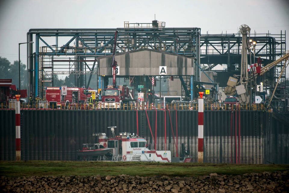 Einsatzkräfte der Feuerwehr arbeiten an der Unglücksstelle am 18.10.2016 auf dem Werksgelände der BASF in Ludwigshafen. Foto: dpa
