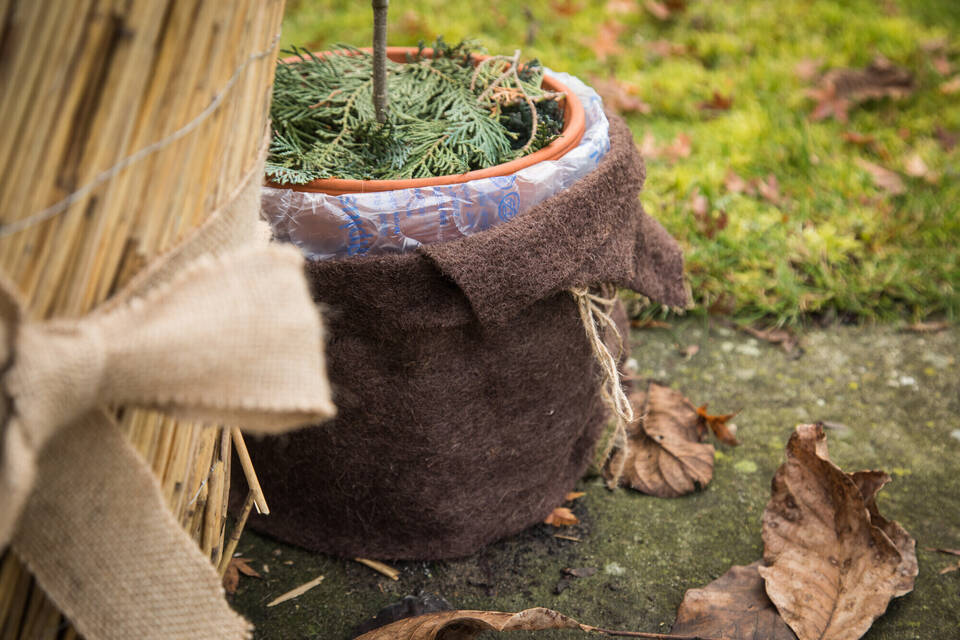 Ist Frost angekündigt, kann man die Töpfe von frostempfindlichen Arten in isolierendes Material wie Noppenfolie einwickeln und auf eine isolierende Unterlage wie Styropor stellen. Das Astgerüst kann man mit Jute oder Vlies abdecken. Übrigens: Große Töpfe isolieren besser und trocknen weniger schnell aus als kleinere.