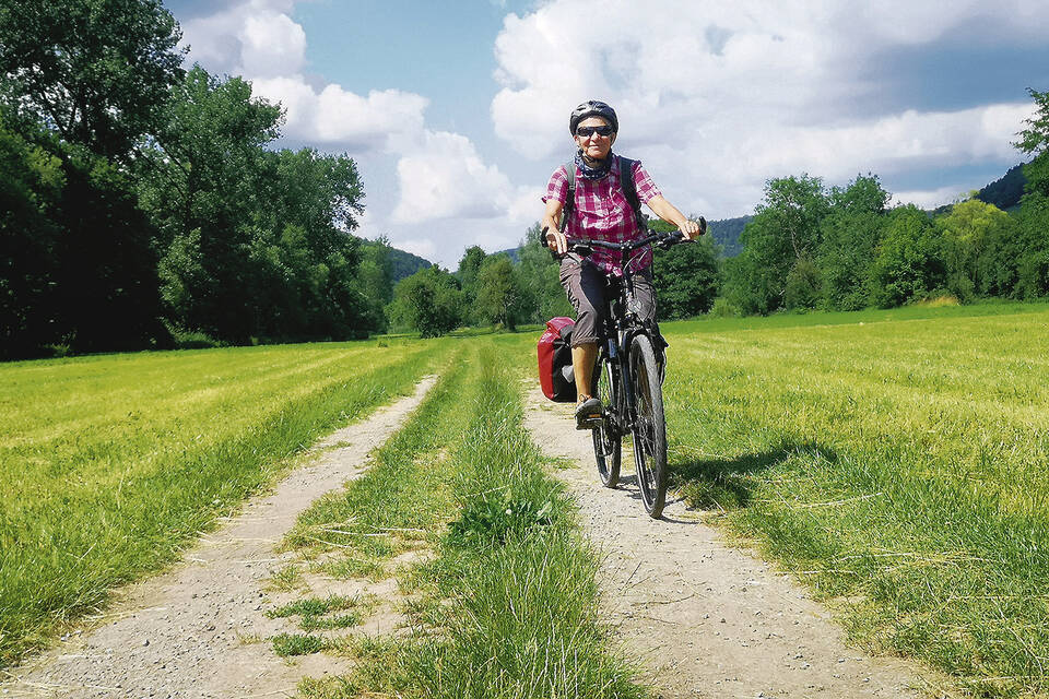 Morgens prasselt der Regen gegen die Fensterscheibe. Mit einem ausgedehnten Frühstück lässt sich das Nass aber gut aussitzen. Gegen zehn Uhr geht’s los. Bei fast schon ohrenbetäubenden Vogelgesängen. Tief hängt der Himmel. Immer wieder beeindrucken an diesem Radweg die ausgedehnten Tal-Wiesen, manchmal mit blühenden Blumen bestückt. Das macht einfach gute Laune. Über kleine steinerne Brücken wechselt der Weg die Uferseite. Es gibt so viel Zeit und Raum, das satte Grün der Natur auf sich wirken zu lassen.