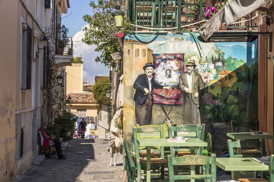 Ruhiger geht es im Viertel Psirri neben dem Monastiraki-Platz zu. Das ehemalige Arbeiterviertel mit den kleinen Werkstätten, Tavernen und alternativen Bars ist heute ein Zentrum für urbane Kunst. Graffiti, Murals und kreative Botschaften von lokalen und internationalen Künstlern wechseln sich ab. Die Motive sind nicht ganz so schreiend wie in Exarchia, dafür humorvoller und zum Teil auch poetisch. Eindrucksvoll sind die "Owl Eyes" vom Künstler Wild Drawing. Im Gazi-Viertel, das für sein lebhaftes Nachtleben bekannt ist, laden die alten Industriegebiete förmlich zu großflächigen Murals ein. Internationale Künstler vereinen ihre Gesellschaftskritik dort gekonnt mit moderner Mythologie und surrealen Motiven.
