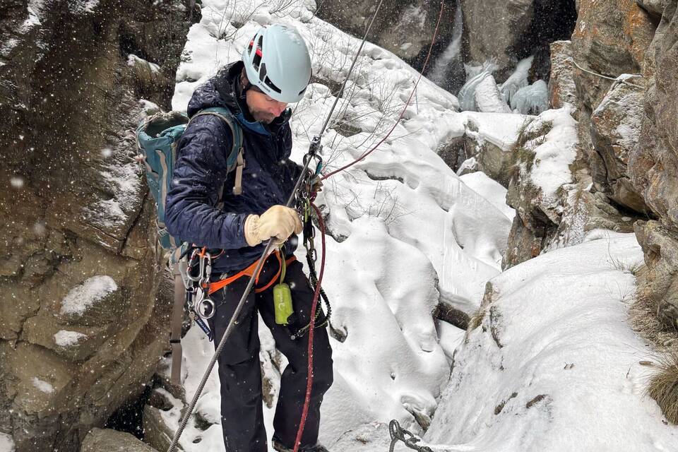 Saas-Fee (dpa) - Wandern in den Bergen - viele genießen das. Aber wem das ewige Auf und Ab bei aller Schönheit der Natur irgendwann dröge wird, der kann am Abenteuer-Tacho drehen: zu Klettergurt und Helm greifen und sich im Zickzackkurs eine Schlucht herunter wagen. Canyoning nennt sich das, und wer auf die Extra-Dosis Adrenalin steht, der macht das einfach im tiefsten Winter.
