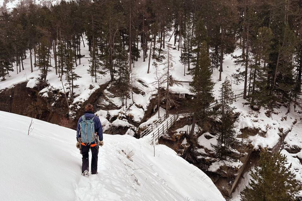 Wir spazieren auf einer kleinen Brücke über die Schlucht. Wasser rauscht, der Schnee unter unseren Schuhen knirscht, sonst hört man nur das Klimpern der Karabiner an unseren Klettergurten.