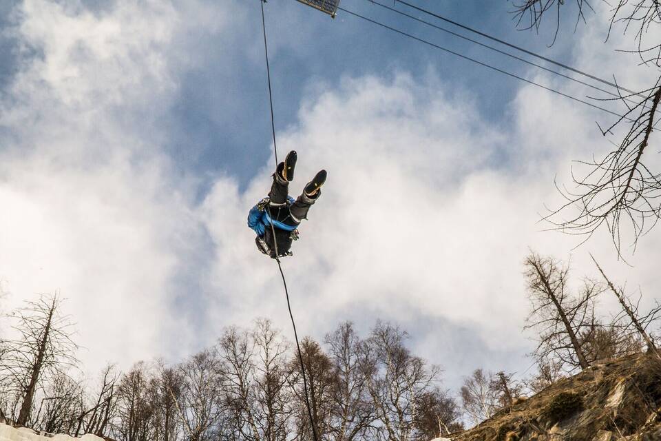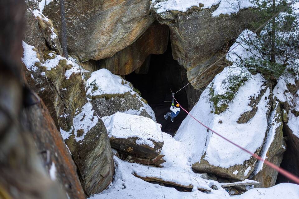 Der Schnee, der nach wie vor ununterbrochen vom Himmel rieselt, und der Wind, der durch die Schlucht weht, wirken während des "Flugs" wie eine Kältetherapie zur Hautstraffung. Aber keine Zeit, um über Anti-Aging nachzudenken: Wer es über die Schlucht geschafft hat, hakt sich aus, sichert sich und macht Platz für die nächste Person.