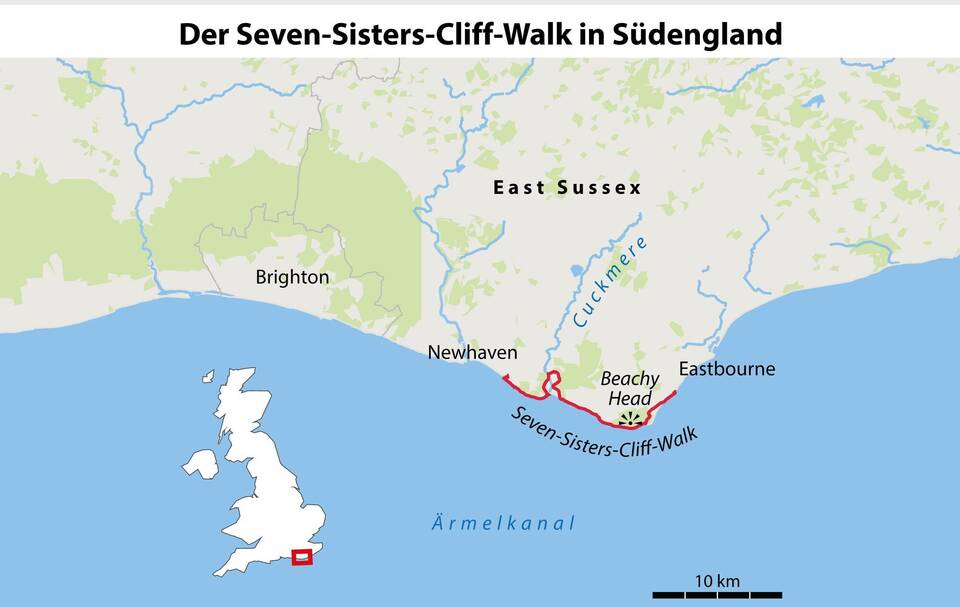 Wissenswertes: Die sieben Schwestern heißen von Cuckmere aus gesehen Haven Brow, Short Brow, Rough Brow, Brass Point, Flagstaff Point, Flat Hill, Baily’s Hill und Went Hill Brow. Beachy Head ist mit seinen 162 Metern als höchster Kreidefelsen Großbritanniens bekannt (zum Vergleich: Der Königsstuhl auf Rügen ist 118 Meter hoch), gehört aber nicht zur Reihe. Die Felsen gehören zum Nationalpark South Downs.