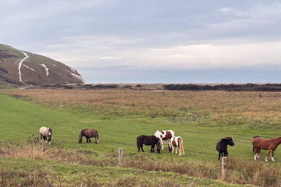 Bei Ebbe könnte ich nun einfach über den Strand weiterlaufen und die erste der sieben Schwestern erklimmen. Aber die Flut macht mir einen Strich durch die Rechnung, sie presst das Wasser in die Mündung des Cuckmere. So ist es zu tief und die Strömung zu stark, um gefahrlos durchwaten zu können. Anstatt etwa 50 Minuten Fußweg zu sparen, laufe ich landeinwärts zu einer kleinen Brücke, und werde auch hier nicht enttäuscht: Gänse, Schafe, Kormorane, Pferde, wilde Brombeeren.