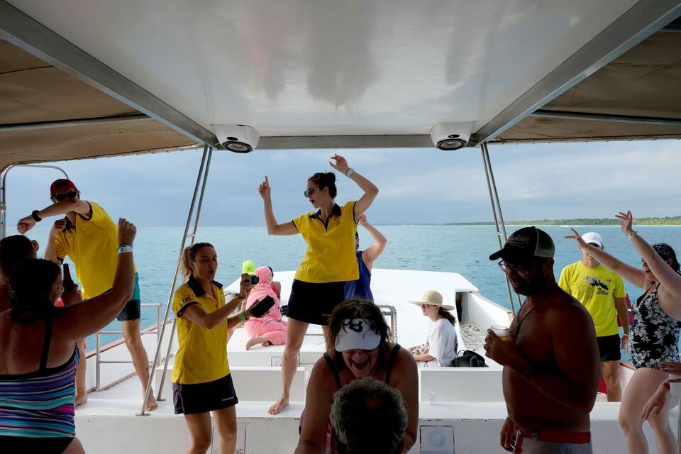 Eindösen wäre allerdings eine schlechte Idee. Viel zu bald schon ruft die Crew zum Aufbruch. Es geht weiter zum Naturpool, einer Untiefe, bauchtief und mit feinstem Sandgrund. Bald liegen ein Dutzend Boote nebeneinander in dem ultratürkisen Planschbecken. Die Reggaeton-Musik dröhnt, Urlauber schütteln ihre Hüften und strecken die tätowierten Arme in die Luft, eine Bardame serviert Bier und Rum-Cola.