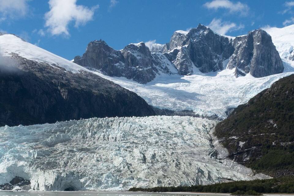 Die Natur ist ein dauerndes Schauspiel. Über dem Pía-Fjord drückt das Eisgrau des Himmels aufs Land. Felsabstürze nehmen Spiegelbäder. Kleine Wasserfälle kleben als Streifen im Grün. Fast unwirklich zieht sich der Pía-Gletscher wie ein heller Fortsatz der Wolken hinab. Er schickt seinen kühlen Atem herüber und ein Krachen, das die Luft zerreißt. Dreimal kalbt er. Die Frontwand wirft sich über hundert Meter hoch auf. Das Frostgebirge mit seinen Zacken, Spalten und Rissen macht sprachlos, demütig.