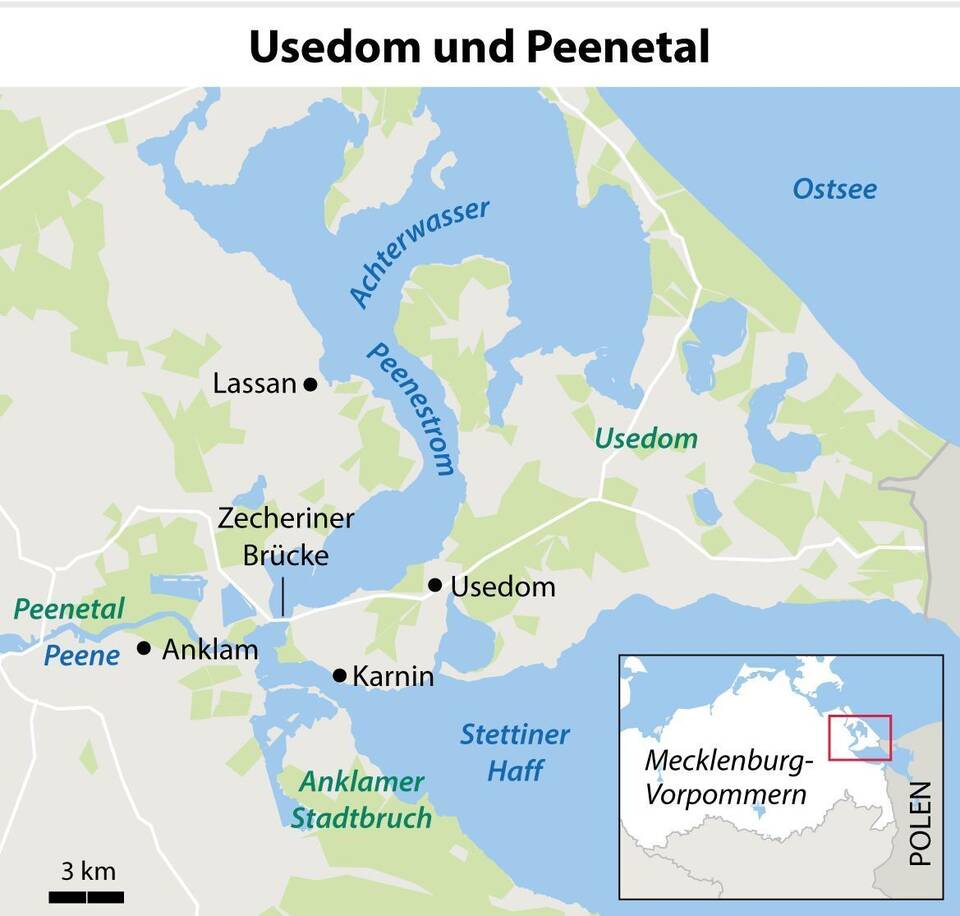 Der Naturpark Insel Usedom ist im Hinblick auf Seeadler einer der Hotspots in Deutschland, neben dem Müritz-Nationalpark und dem Anklamer Stadtbruch. Dafür gibt es vor allem einen Grund, sagt Wigger: Usedom sei umgeben von fischreichen Gewässern - auf der einen Seite die Ostsee, auf der anderen der Peenestrom mit dem Achterwasser, einer großen Lagune.