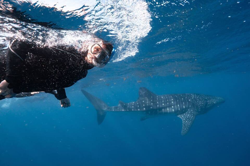 Wie die Lemminge schieben sich die Gäste auf dem Po zum Heck des Bootes. Plumps, plumps, plumps, verschwindet einer nach dem anderen im Wasser. "Jetzt die Linien bilden!", ruft Georgia. Wie an Perlenschnüren aufgereiht und vorab genau instruiert, halten die Touristen in zwei Reihen mit Taucherflossen paddelnd Position. Was sie sehen wollen: den größten Fisch der Welt, den Walhai.