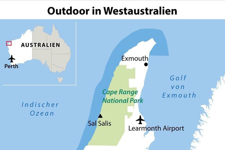 Reiseziel: Exmouth, Ausgangsbasis für Touren zu den Walhaien, liegt auf der Halbinsel North West Cape, gut 1.100 Kilometer nördlich von Perth, der Hauptstadt Westaustraliens. Im Westen des Kaps liegt der Cape Range National Park, vor der Küste, Coral Coast genannt, das Ningaloo-Riff.