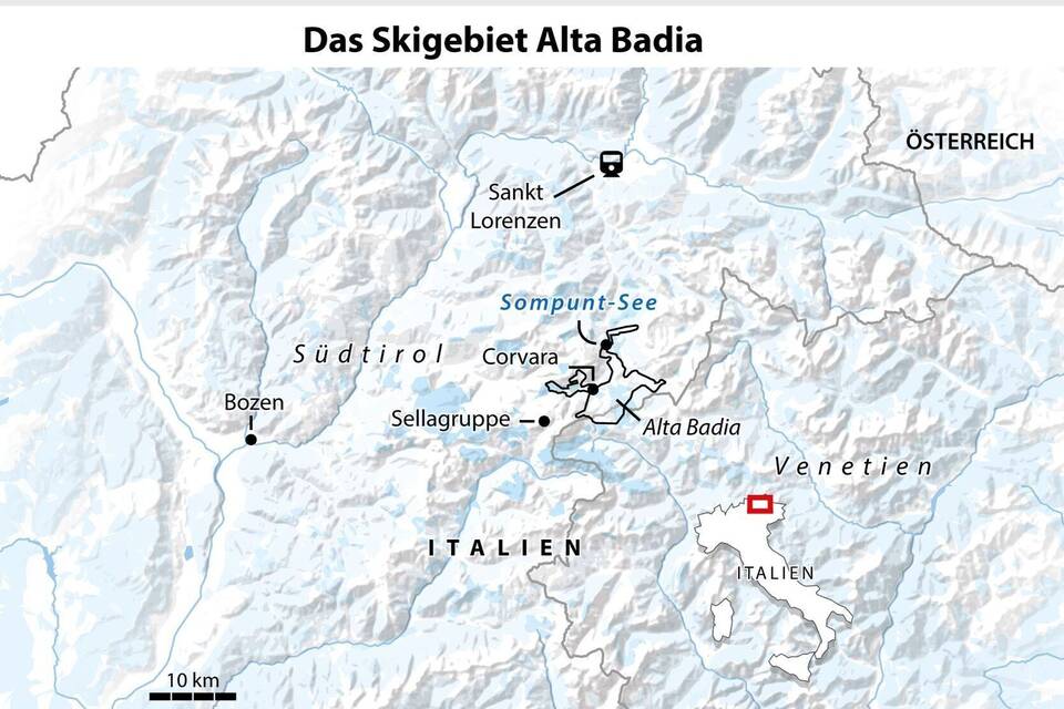 Unterkunft: In den Dörfern gibt es viele Hotels mit eher gehobenen Preisen. Wer morgens den Panoramablick auf die Dolomiten und die Pisten für sich allein haben will, bucht ein Zimmer in der "Las Vegas Lodge" in St. Kassian (auf 2.050 Metern in den Dolomiten) oder im Berggasthof "Pralongiá" in Alta Badia.