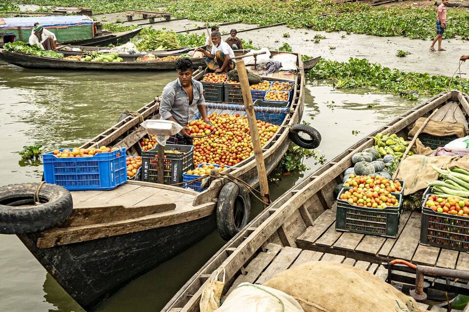 Auf einem schwimmenden Markt im verzweigten Flusssystem des Golfs von Bengalen werden vom Boot aus Tomaten, Gurken, Rettiche und Kürbisse angeboten. Das Leben spielt sich auf dem Wasser ab. Jeder winkt uns freundlich zu. Vom Boot aus sehen wir Kinder auf dem Weg zur Schule, Fischer werfen ihre Netze aus, Bauern bestellen ihre Felder, die Landschaft wirkt wie eine