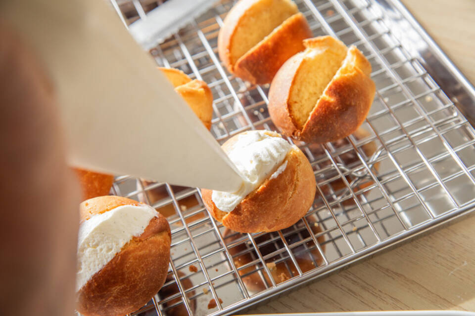 4. Milchbrötchen aufschneiden, mit Creme füllen, glatt streichen. Nach Belieben verzieren und mit Puderzucker bestäuben.