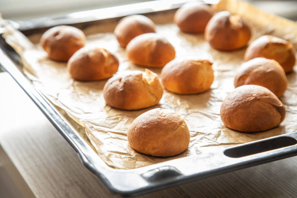 2. Am nächsten Tag Teig zu Kugeln à 30-40 g formen, auf ein Blech legen, abdecken und weitere 1 1/2-2 h gehen lassen. Bei 180 Grad (Umluft) 15-18 Minuten goldbraun backen. Auf einem Gitter auskühlen lassen.