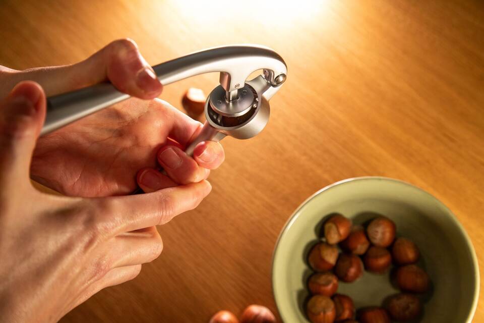 Und so geht's: Die Haselnuss legt man dem Hack zufolge in die Knoblauchpresse - und drückt diese fest zusammen, bis es knackt.