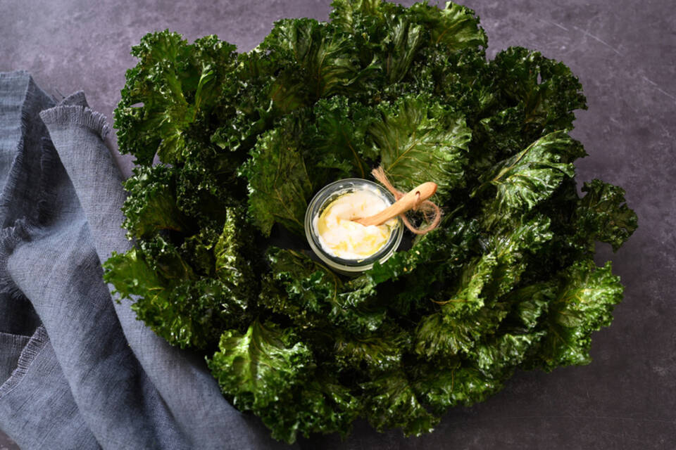 Grünkohlchips mit Zitronen-Joghurt-Dip
