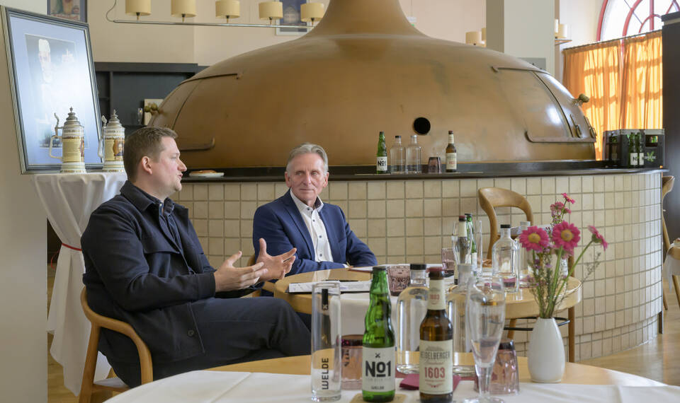 Übergabe im „Braustübl“: Nach 50 Jahren übergibt Michael Mack (r.) sein Familienunternehmen, die „Heidelberger Brauerei“, an Max Spielmann, der seit 2019 Chef der Welde-Brauerei ist. Foto: Rothe