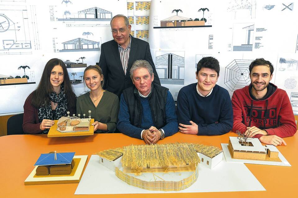 Melanie Büttner, Nikola Steinhardt, Prof. Kenn Schwarzbart, Nicolas Ctvrtnik und Torsten Herms (v.l.) zeigen Gerold Mehrmann vom Haßlocher Förderverein (hinten) ihre Entwürfe für die Entbindungsstationen in Mali. Foto: Rothe