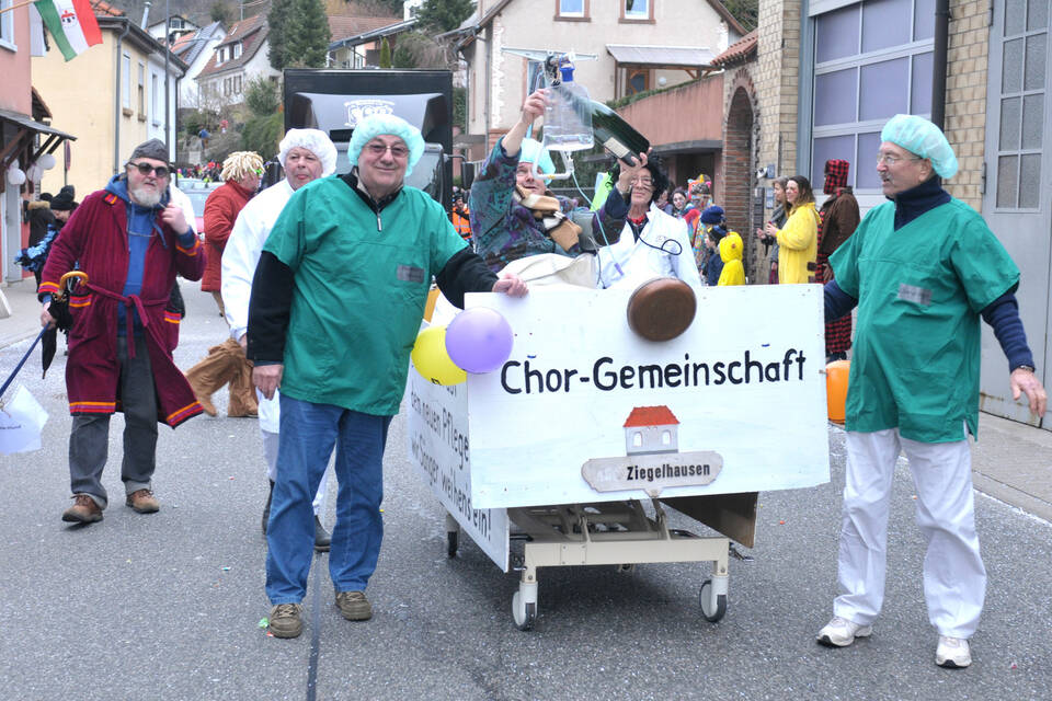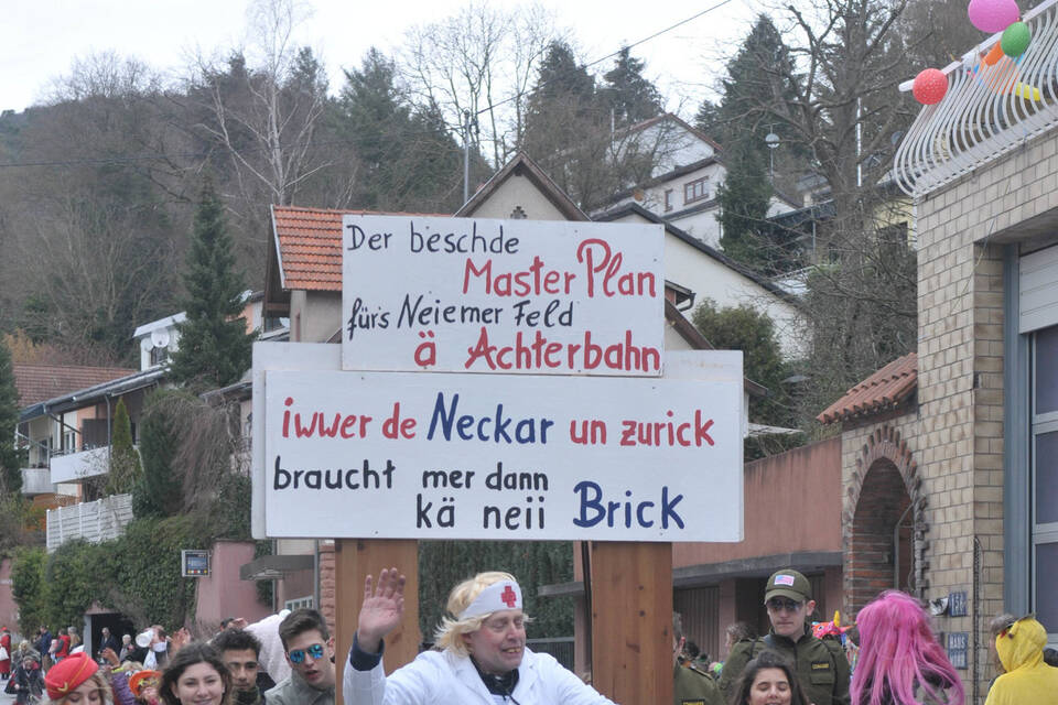 Die große Stärke des Zuges war der Lokalkolorit: Da saß die "zwett Generation" des "Peterstaler Bergvolks", das "Waldhorn"-Wirtin Annette Jung anführt, "fescht im Voggelnescht". Die rot perückten "Ziggelhaiser Ladykracher" erinnerten an den vergangenen Drachenbootwettbewerb, und die TSG-Volleyballer sportelten "mit Knall" ins Tal, die Handballdamen der TSG suchten "uff der Stroß" die "letzte Theke", während die Chorgemeinschaft von Arbeitergesangverein und "Liederkranz" unbedingt in das neue Pflegeheim "im Dorf" wollte. Lokalpolitik steuerte die Spaßgesellschaft bei, die für den "Schluss mit dem Zirkus in der Altstadt" eintrat, und die "Hutbrummer" forderten eine "Achterbahn ins Neuenheimer Feld", und schließlich wies die "Ranzengarde" des Stadtteilvereins auf den 800. Geburtstag Ziegelhausens im kommenden Jahr hin.