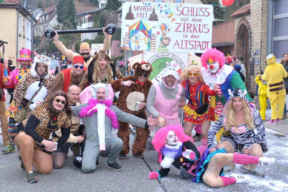 Die muntere Truppe der Ziegelhäuser Spaßgesellschaft wollte gestern mit dem "Zirkus in der Altstadt" aufräumen - und morgen kann sie das sogar beim Heidelberger Umzug auch vor Ort tun. Foto: Dagmar Welker
