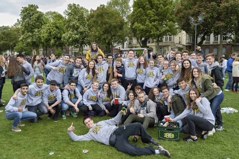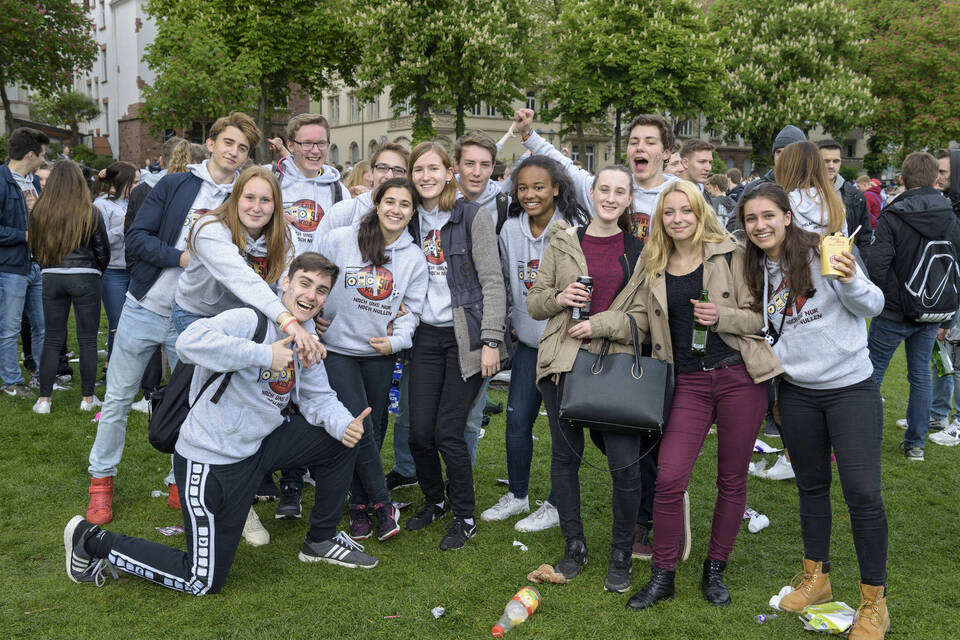 Die Jugendlichen, die noch nicht zu tief ins Glas geschaut hatten, standen unterdessen in Grüppchen um ihre auf dem Boden liegenden Rucksäcke - und Flaschen. Ihre Abi-Pullover zierten Sprüche wie "Mehr dichter als Denker" oder "Muhammad Abi". Viele hatten zusätzlich ihre Wangen mit "Abi 17" oder "AK 17" (Abschlussklasse) verschönert. Die meisten waren gut gelaunt und wollten einfach nur ihren Abschluss feiern. "Ich muss nie mehr in meinem Leben eine Matheprüfung ablegen", freute sich etwa Mareike (18), die ihr Abitur am Bunsengymnasium macht. Andere waren eher dabei - statt mittendrin: "Ich warte, bis es vorbei ist", gab die 16-jährige Lara von der Realschule St. Raphael zu. Ihr war das wilde Treiben nicht ganz geheuer - und so erging es auch einigen anderen Jugendlichen.