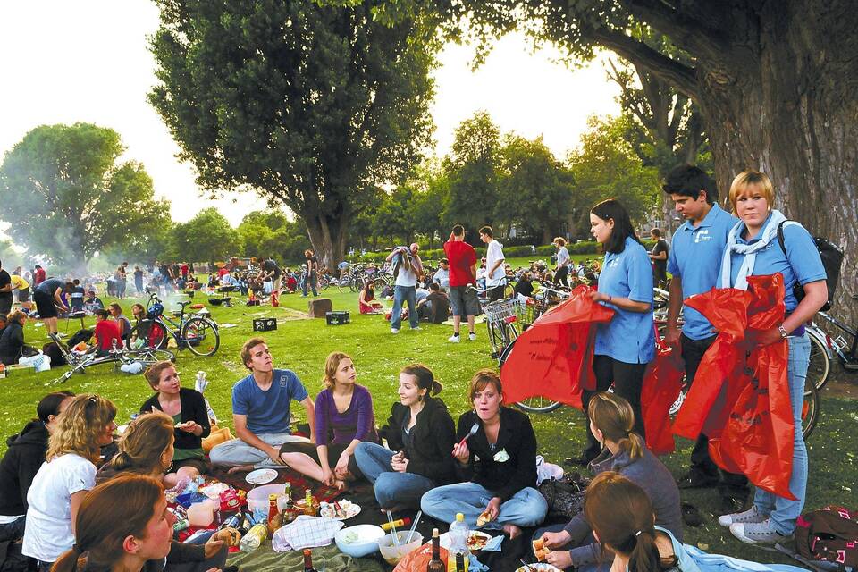 Vor acht Jahren, am 20. Mai 2009, verteilte der Jugendgemeinderat Müllsäcke an die Besucher der Neckarwiese - unabhängig von Abifeiern. Es war eine der wenigen Eigeninitiativen, bei denen sich junge Leute um den Zustand dieses grünen Wohnzimmers der Stadt kümmern. Foto: Hentschel