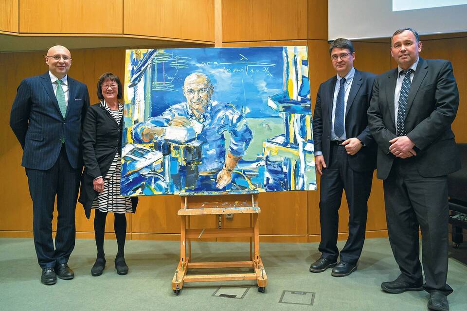 Baumann begrüßte im Kommunikationszentrum des DKFZ rund 250 Gäste und Kooperationspartner aus Politik und Industrie, von Uniklinik und Universität sowie anderen Heidelberger Forschungseinrichtungen. Auch die beiden Heidelberger Nobelpreisträger Harald zur Hausen und Stefan Hell waren dabei. Und Chemienobelpreisträger Hell, der am morgigen Sonntag in Berlin den Bundespräsidenten mitwählt, durfte sich über eine besondere Würdigung freuen. Das DKFZ hatte die Heidelberger Malerin Dora Mittenzwei mit einem Porträt beauftragt, das am Ende des Abends feierlich enthüllt wurde.