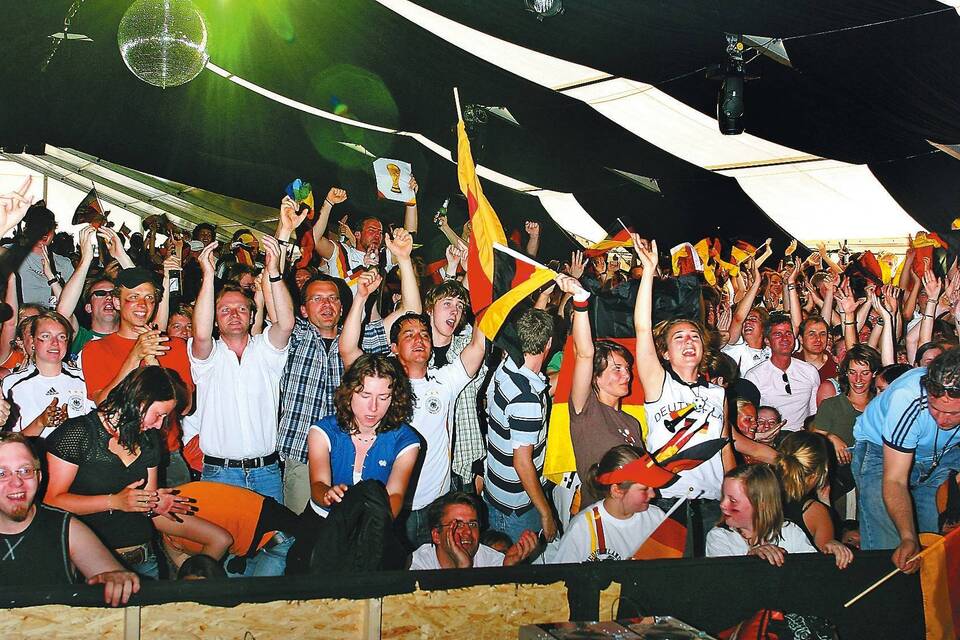 Über 2000 Menschen feierten am 9. Juni 2006 im Zelt der Halle 02 den deutschen 4:2-Sieg über Costa Rica im WM-Eröffnungsspiel. Danach mussten die Veranstalter "aufrüsten". Foto: Alex